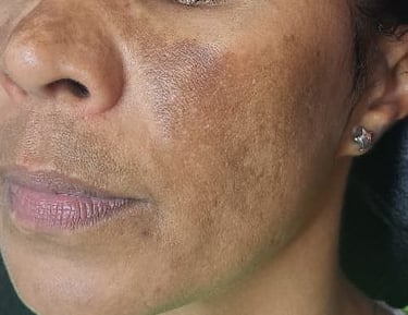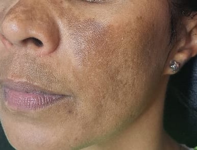 Melasma: Manchas escuras hormonais e solares, comuns nas bochechas e testa.