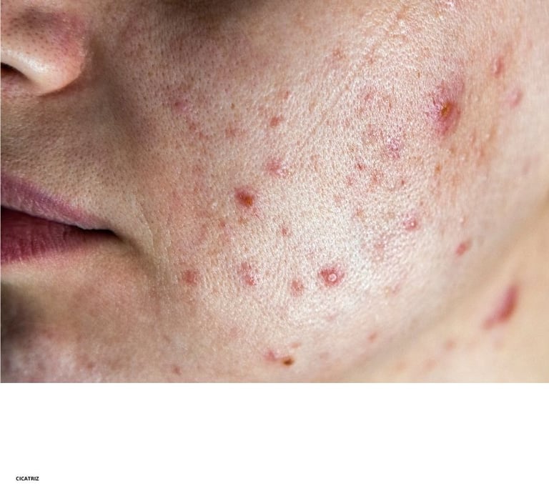 Cicatrizes de acne são marcas permanentes na pele após inflamações, variando de vermelhidão a depressões ou elevações (atróficas, hipertróficas/queloides). Surgem pela destruição de colágeno ou excesso de produção, sendo agravadas por manipulação e gravidade da acne.