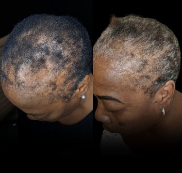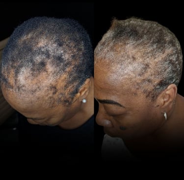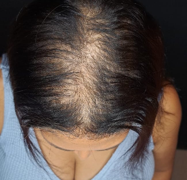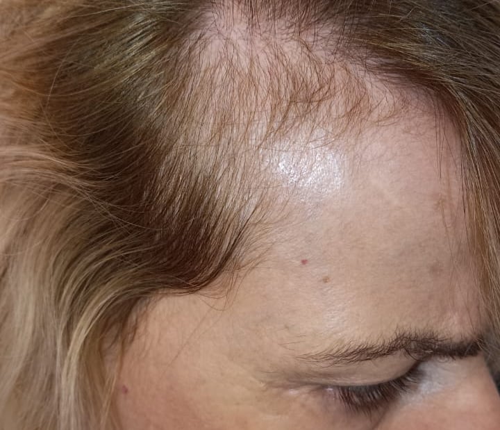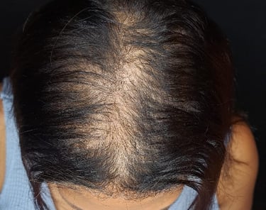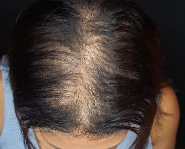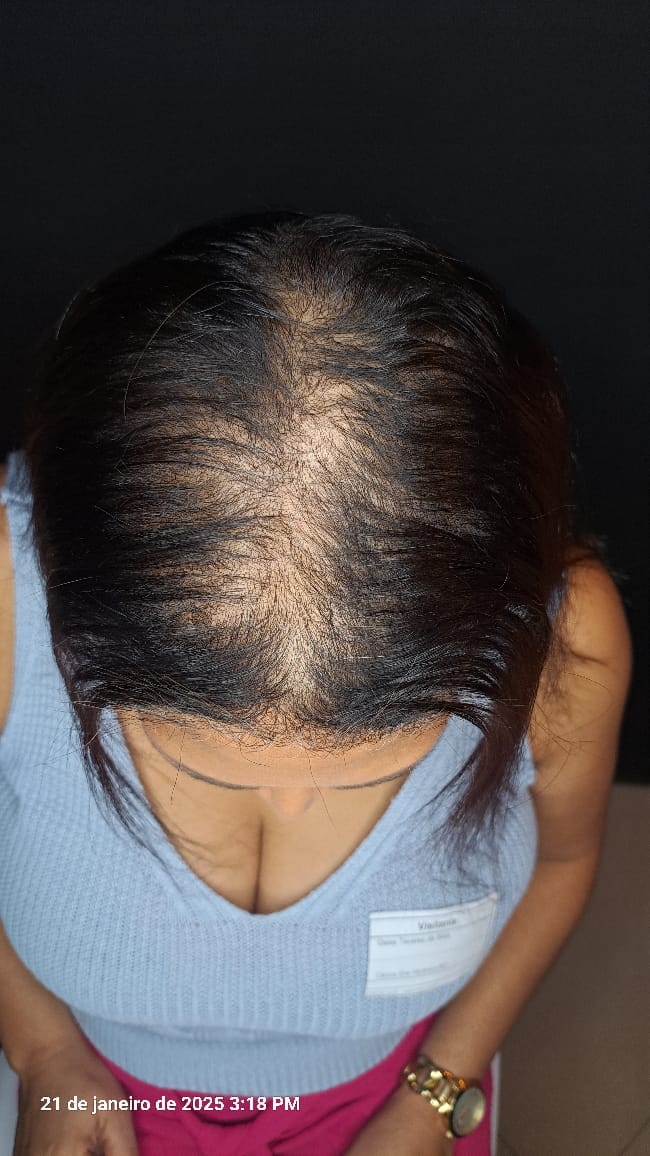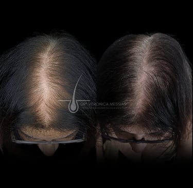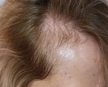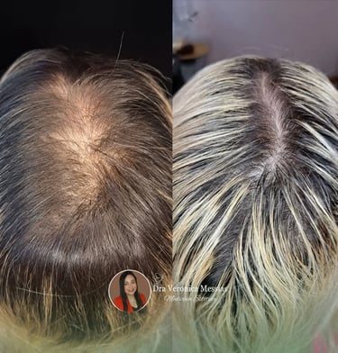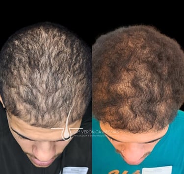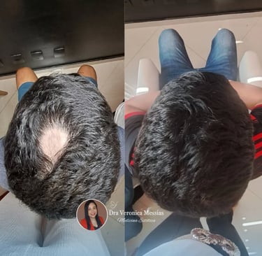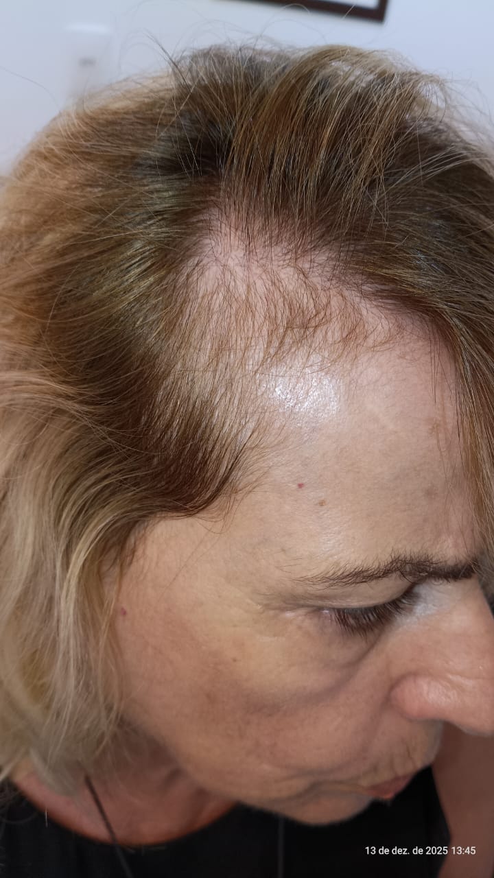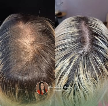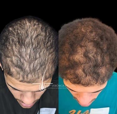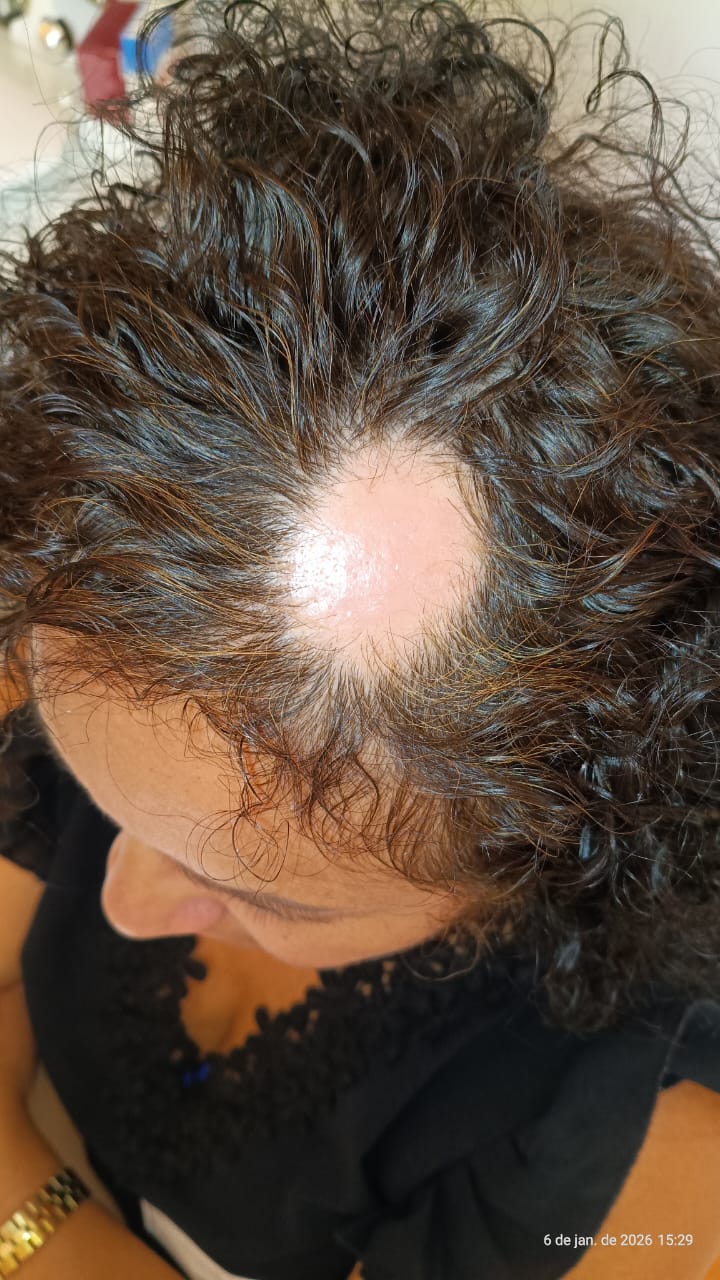 Perda de cabelo de origem genética e hormonal, que afeta tanto homens quanto mulheres.